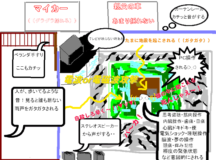 何か、人工的に作られたような声で、吠えたり、鳴きます・・? それとバイクなどが、通るとその音が、(自殺しちゃえ・おかしくなれ~) などと聞こえます?!その他、ラジオやヘッドホン着けても無駄です・・ どんなにボリューム上げてもダメでした・・・聞こえる・・ 今日などベロ(舌)を思い切りすばやく出したり引いたりすると・・ なぜか・・唇に電気を帯びた感じがしましたが・・・いくらやっても やはりダメ・・電気エネルギーを取れば、少しは、声聞こえなくなるかと・・ 思ったが無駄でした・・(>_<) お風呂でシャワーを結構流しっぱなし で、口から垂れるようにしましたが・・・ダメ( ̄□||||!! なにをしても無駄です(-_-;) どんなに逃げても無駄(ーー;) こうなったら・・あなたなら・・どうしますか?感想書いてね! まとめ報告書こうと思ったけど・・・またにします。 |
